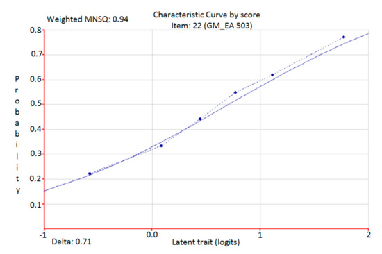 The MCS was designed based on Item Response Theory (IRT) [35,36,37]. IRT, by estimating each individual item’s discrimination on the latent trait and difficulty within a population, provides information on the validity of the items and identifies low performance indicators. Through the specification of a mathematical statistical model, IRT allows the evaluation of the performance of a given subject as a function of his/her latent ability. As a result, IRT assesses both respondents’ performance and the characteristics of each item offering the possibility to evaluate individual characteristics and to compare performance across subjects [37,47]. In other words, IRT is appropriate for developing instruments aimed at accurately measuring a specific level of the ability assessed. One example of the IRT is the Mathematical Achievement Test (MAT) [48,49], used across all grades of secondary school, which measures students’ modelling competencies and algorithmic competencies in arithmetic, algebra, and geometry. In psychometric field, the true unknown measure is latent and unobservable so the classical calibration models cannot be applied. In some statistical models, the answers to the items (Y1, Y2, …, Yn) are functions of some psychological characteristic (X) that is called latent. As suggested by De Battisti, Salini and Crescentini [49]: the most important model to define the measure of a latent variables is the Rasch model (Rasch, Copenhagen, Denmark, 1960) [50]”. The Rasch model allows measuring both item difficulty and subject ability. The following relation expresses the probability of a right answer in the dichotomous case: xij is the answer of subject i (i = 1, …, n) to item j (j = 1, …, k), i depicting the skill of the subject i and j is the difficulty of the item j.