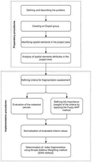 The architecture of an index of fragmentation model is defined by the diagram shown in Figure 1. Taking into account that the primary research point is the problem of land ownership within the area of the large public project, the set of alternatives refers to private land. At the beginning, it is necessary to define the ideal private cadastral parcel, the ideal spatial element (a set of cadastral parcels and its parts that make up a particular unit) and an ideal building area for the realization of the future project. Since the cadastral parcel is the smallest unit assigned the attribute of ownership, the research begins by defining its ideal form. It is necessary to identify which attributes should have an ideal private cadastral parcel and based on that define the criteria to evaluate and compare the defined alternatives.