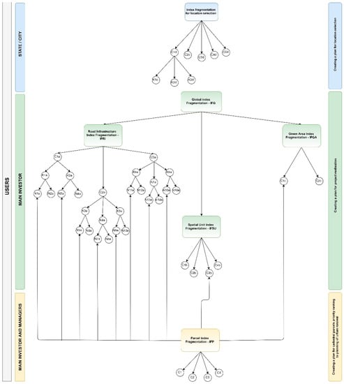In the beginning, it is essential to define the general term of the index of fragmentation. For the realization of any project that has a spatial element, it is very important to evaluate the pre-existing condition of the land. The land evaluation method depends precisely on the purpose of a particular project, i.e., on the definition of the necessary criteria that affect its realization. Based on those mentioned above, the general term of the index of fragmentation would be the evaluation of spatial elements in relation to the deviation from their ideal form. The ideal form of a spatial element depends on a specific task, and given that the subject of this paper is support for the sustainable urban renewal planning to realize large public projects, its ideal form is determined based on identified criteria that influence the progress of project implementation. Considering that the planning of the large public projects is a strategic process and encompasses multiple levels of planning, the index of fragmentation can be defined for each of them, as one of the criteria of the hierarchical goal structure in the decision-making process. One of these planning levels along with defining the hierarchical goal structure for the purpose of implementing the expropriation procedure for the private land parcels acquisition in the area of the campus project, University of Split is presented in the paper Kilić et al. [38]. The problem is primarily to identify all relevant criteria at all planning levels as well as their interrelationships, for their evaluation and relative comparison.