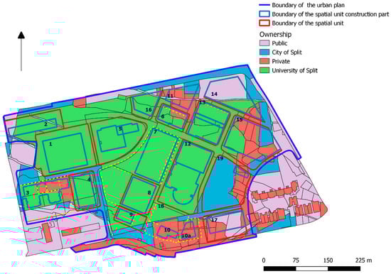 The basis for spatial analysis was the overlap of the existing land subdivision defined by the official data of the cadaster and urban plan of the campus project. These documents defined the facilities within the campus (most relevant for this study were spatial units that related to faculty buildings and other objects in function of the University, the road infrastructure and the green area) and the boundaries and conditions of their future construction. The urban plan represented a new land subdivision of the project area in such a way that new cadastral parcels represented construction parcels in accordance with spatial planning documentation and rules that apply to the area of project realization. The research included subprojects relating to spatial units, road infrastructure and green areas whose realization had not been implemented nor has the way of implementing them been planned. Accordingly, property ownership, along with the financial segment, was the fundamental limiting factor for planning the realization of subprojects within the campus area, which was primarily related to private owners who are residents in the defined area. The distribution of private cadastral parcels, their relation to the entities to which they belong as well as land allocation affiliation defined by the urban plan were key spatial elements that affected the progress of project realization. Figure 4 shows the research area bordered by the urban plan boundary, with a special emphasis on cadastral parcel ownership. The numbers within the figure indicate spatial units as areas of existing and future facilities in the project area of the campus.