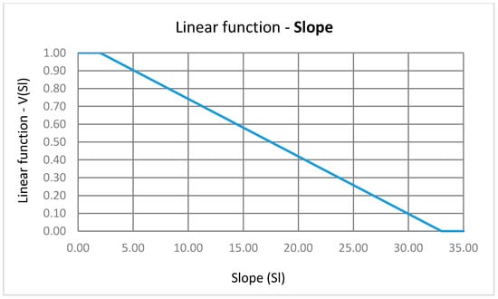 The value of the “Slope” criterion is defined by the linear transformation of the cadastral parcels’ slope expressed in degrees in the range from 0 to 1. In accordance with the ordinance of standards for the determination of particularly valuable land for cultivation (P1) and the valuable agricultural land (P2) [48], value 1 was assigned to those cadastral parcels having a slope from 0° to 2°, while value 0 was assigned to the cadastral parcels which have a slope of 33° and above. The linear function for slope normalization was defined by the expression ( is slope of the cadastral parcel j, is normalized slope value of the cadastral parcel j, and is an expression for linear function):