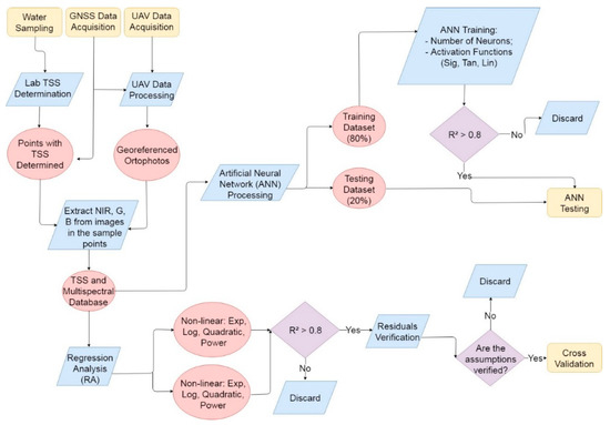 The method that we are proposing can be structured according to the following steps: GNSS (Global Navigation Satellite System) data acquisition, water sampling and laboratory analysis, overflight with the UAV and processing of the images, extraction of values from images UAV, regression analysis, and training and testing of the ANN. The flowchart of the proposed method is depicted in Figure 1 and detailed in the following subsections.
