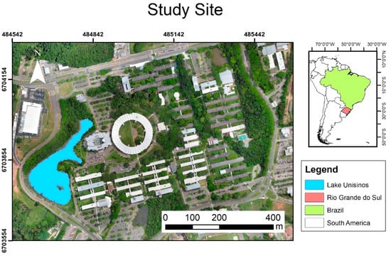 The adopted study site was the lake on the Unisinos University campus, located in the state of Rio Grande do Sul, southern Brazil (Figure 2). The lake is artificial, has an area of approximately 0.025 km² and maximum depth of 4 m. Although small, it is located at the lowest altitude of the campus, and because it is formed from rainwater drainage collected at the university, it contains several inorganic and organic compounds found in the form of suspended solids or organic matter from rainwater runoff [18].
