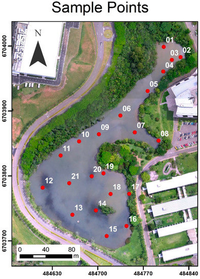 We selected 21 sample points, as shown in Figure 3, that were spatially distributed over the lake such that surface water samples (up to 0.5 m) were collected for the laboratory determination of suspended solids using the gravimetric method described in the Standard Methods for the Examination of Water and Wastewater [22].