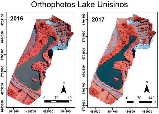 Finally, although studies as this serve as pilot studies to be applied in larger water bodies, we emphasize that adaptations need to be made for this to occur because when flying with a UAV in lakes and dams because large homogeneous areas makes it difficult to generate orthophotos and products generated from the Structure for Motion (SfM) technique. One of the ways to minimize this problem would be to perform high altitude flights, facilitating the identification of homologous points in the images for generating the orthophoto, but which would result in a loss in resolution of the images.