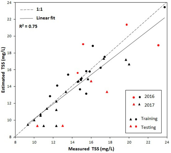 Comparison between TSS measurements and estimated values from the ANN model in training (black) and testing (red) set using March 2016 (circular shape) and 2017 (triangular shape) samplings.