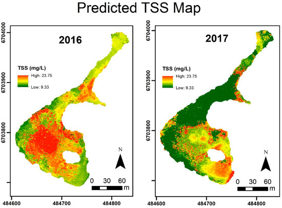 Finally, the ANN model was used to predict the TSS concentration for the whole lake using the NIR, G, and B variables for the 2016 and 2017 UAV images. Thus, the generated TSS maps for Lake Unisinos are shown in Figure 6.