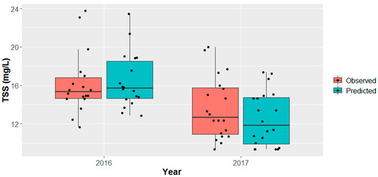 Box plot of TSS concentrations for observed and predicted values in 2016 and 2017.