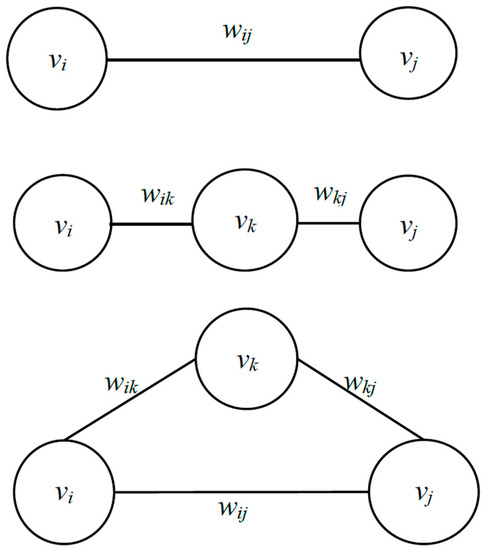 V = {vi, vj|i,j = 1,2,3,…, n}, E = {eij|i,j = 1,2,3,…, n}, W = {wij|i,j = 1,2,3,…, n}, n denotes the number of cities. When there is a rail line between city vi and city vj before upgrading, then wij = 1, and the travel time is wij·eij. Otherwise, when a rail line between vi and vj is upgraded to an HSR line, then wij = 9/25. When there is a route between vi and vj not through the upgraded line, the travel time of this route R < vi, vj > can be defined by R < vi → vj > = wij·eij. When there is a route from vi to vj through an upgraded line and should take a transfer only at node k, then the travel time of this route R< vi, vj > can be defined by R< vi → vk → vj > = wik·eik + wkj·ekj + t. Therefore, the route running from vi to vj includes R< vi → vj > and R< vi → vk → vj >, as shown in Figure 2. t is the transfer time, which is a constant. When the route from vi to vj should take transfer at p cities, then the transfer time is p·t.