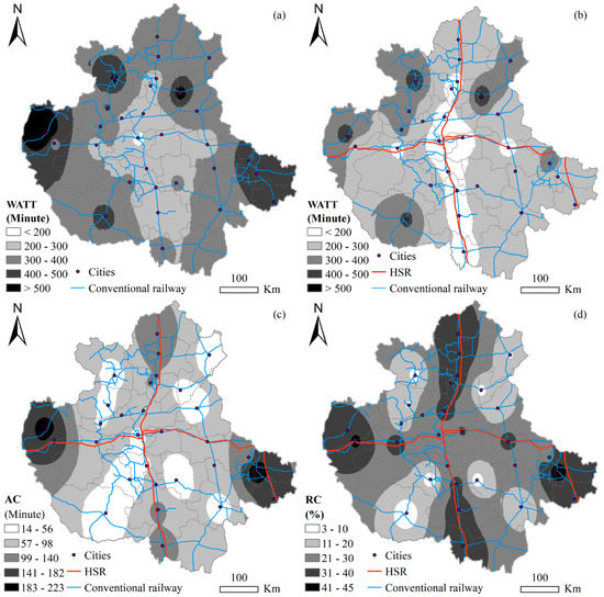 Spatial distribution of accessibility by WATT. Explanation for (a–d) here. (a) Without HSR Scenario WATT; (b) With HSR Scenario WATT (c) Absolute Change; (d) Relative Change.