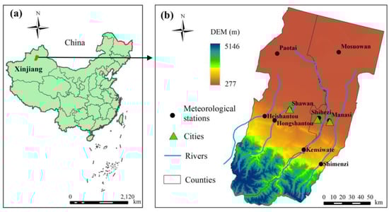 (a) Location of the Manas region and (b) a digital elevation model of the study area.
