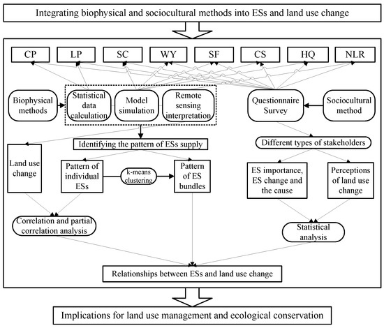 Framework for integrating biophysical and sociocultural methods into ecosystem services (ESs) and land use change. CP—crop production, LP—livestock production, SC—soil conservation, WY—water yield, SF—sand fixation, CS—carbon fixation, HQ—habitat quality, and NLR—nature landscape recreation.