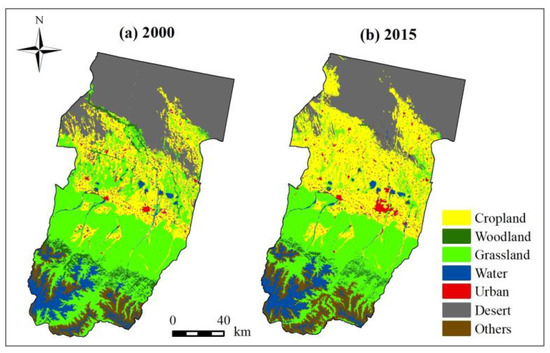 Land use of the study area in 2000 (a) and 2015 (b). The land use datasets were interpreted by Landsat TM and was provided by the Data Center for Resources and Environmental Sciences, Chinese Academy of Sciences [53]. The accuracies of the land use maps were more than 95%.