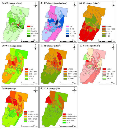 Spatial distribution of ecosystem service (ESs) changes in the township level from 2000 to 2015. The figure shows (a) crop production change, (b) livestock production change, (c) soil conservation change, (d) water yield change, (e) sand fixation change, (f) carbon sequestration change, (g) habitat quality change, and (h) nature landscape recreation change.