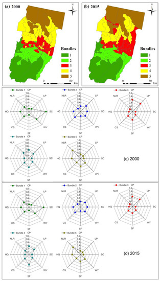 The area covered by Foothill bundle decreased by 183.66 km2, changing from 3627.48 km2 in 2000 to 3443.82 km2 in 2015. In response, the proportion of the total study area changed from 15.80% in 2000 to 15.00% in 2015. The ES levels were relatively high for CS, HQ, and LP services because of the high amount of vegetation (e.g., grass) coverage in these types of area (Figure 5c,d).