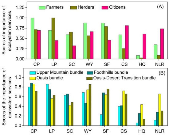 Figure 6B showed the importance of each ES in different ES bundles. The scores of the importance of CP were notable high (more than 0.65) and was viewed a relatively important ES in all ES bundles. LP and SC was viewed as more important in the Upper Mountain and Foothill bundles than Oasis and Oasis–Desert Transition bundle. The scores of the importance of WY and CS were notable high (more than 0.65) in the Oasis and Oasis–Desert Transition bundle. SF was viewed as more important in the Oasis–Desert Transition bundle, while HQ and NLR were viewed as most important in the Oasis bundle relative to other bundles. Overall, the scores of the importance of provisioning services were higher in the Upper Mountain and Foothill bundles than other bundles, whereas the scores of the importance of most regulating and cultural services were higher in the Oasis and Oasis–Desert transition bundles than other bundles.