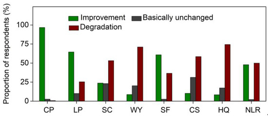 The perceptions of the improvement or degradation of ESs showed that most respondents believed that provisioning services had been improved; however, most regulating services, except for SF, had declined in our study area (Figure 7). The majority of the respondents considered CP to have improved. In the study area, agricultural technology and social level developed rapidly; thus, CP was believed to have improved by most respondents. Although 64.53% of the respondents believed that LP improved, 25.38% considered that degradation occurred in LP, which was associated with the ecological policy, such as closing hillsides to grazing. The majority or 74.35% of the respondents believed that HQ declined, followed by WY (71.08%), CS (58.53%), SC (53.21%), and NLR (49.93%). Moreover, 47.89% of the respondents considered NLR to have improved, which may be associated with residential location.