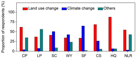 On the basis of the questionnaire results about the reasons for ES change, more than 50% of the respondents believed that land use change was the main cause of the changes in CP, CS, HQ, and NLR (Figure 8). However, less than 40% of the respondents believed that land use change was the main cause of the changes in WY, SF, and LP. The changes in WY, SC, and SF were considered by most respondents to be caused by climate change. However, on the basis of the questionnaire results, the cause of the changes in LP was unclear. Overall, for each ES, at least 30% of the respondents believed that land use change was the main cause of ES change (Figure 8).