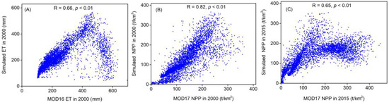 WY simulated by water balance equation decreased from 105.76 mm in 2000 to 7.22 mm in 2015. The records of hydrological stations indicate that the runoffs showed a downward trend since 2000 (Figure A5), which enhances the credibility of the water balance equation in the study area. ET is a critical and uncertain parameter in the process of simulating water yield. It has strong variability and is affected by physiological vegetation factors and complex environmental factors. Therefore, the rationality of the water balance equation in the study area should be evaluated. At present, the period of MOD16 products only covers 2000–2014, and the simulated ET is compared with MOD16 ET in 2000 (Figure 9A). The significant correlation between MOD16 ET and simulated ET (R = 0.66; p < 0.01) indicates the rationality of the water balance equation in the study area. MOD17 NPP data were compared with the simulated NPP in this study. MOD17 NPP values are significantly correlated with the simulated NPP in 2000 and 2015 (R > 0.65; p < 0.01; Figure 9 B,C), which indicates the rationality of the CASA model in the study area. There seems to be nonlinear relationships between MODIS products and the simulated values (Figure 9A,C). The reason may be that the values of MODIS products (i.e., NPP and ET) in forests were underestimated in arid region of China, which also found by other research [28].