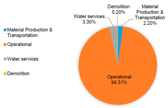 A university campus consists of different infrastructure systems that consume vast quantities of water and energy throughout their life cycles. Figure 1 shows that most of the energy over the entire lifespan of a building is consumed during the operational phase [30]. During the operational phase, buildings are believed to emit 50% to 80% of emissions in their entire lifespan [30,31,32]. Managing the environmental impacts and optimizing water and energy consumption are critical steps in the pursuit of objectives, such as zero-energy, green buildings, and sustainable campuses [33]. Top 10 GHG emitting HEIs in Canada are listed in Table 1 [34]. The average value for the HEIs listed in Table 1 is 4.41 tCO2e per FTE student [34]. In the United States, average annual GHG emissions from all institutional classifications (colleges and universities) were reported as 7.67 tCO2e per FTE student for the year 2010 [35]. With an increase in efforts towards sustainability, significant reductions have been noticed by the HEIs in the country during the present decade. A 13% reduction in just four years (2010 and 2014) from around 11 tCO2e per FTE student to 9.55 tCO2e per FTE student was reported by University of Nebraska-Lincoln [36]. Another example is the Massachusetts Institute of Technology where the total net emissions fell 20 % below 2014 baseline, primarily due to shifting to renewable energy sources. It is worth to mention that 3% increase in total emissions was observed due to an increase in the area of buildings [37]. Hence, continuous efforts would be needed for sustainable buildings’ operations in future all over North America.
