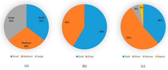 Summary of the sustainability tracking assessment and rating system (STARS) size-based evaluation: (a) distribution of reporting universities, (b) performance of large-sized universities, (c) performance of small- and medium-sized universities.