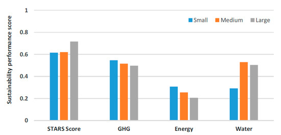 The possible reasons for these results are outlined here. Small universities manage a smaller number of students, have smaller infrastructures, and relatively less-complex processes. The emissions of large-sized HEIs are normalized over a large number of students (i.e., tCO2/FTE) and may result in a higher sustainability ranking. Large universities accommodate more students per water consuming activity, such as laboratories, washrooms, and treatment plants, with larger economies-of-scale. GHG generation per square foot in large-sized HEIs is less than that of medium- and small-size HEIs. Energy consumption is directly related to the size of a building. Therefore, medium-sized HEIs are more critical because buildings are constructed for longer lifecycles.