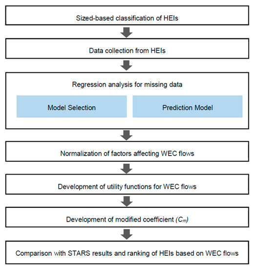 The methodology adopted to assess the performance of the WEC flows in this research is shown in Figure 4. Data for WEC flows were obtained from selected universities, government reports, and the STARS database. Based on the available data for a given climatic region, a regression analysis was conducted to interpret the missing data for three unreported universities: Selkirk College (S3), Camosun College (S12), and Concordia University (L3). GHG emissions in HEIs is a function of different factors (utilities) including energy, water consumption, number of FTE students, and floor area, which are measured in different units, and need to be normalized. The utility of overall GHG emissions for all the HEIs was estimated as a function of these different utilities. Normalized sustainability scores for WEC flows using STARS data were also estimated for comparison with the study results. All the HEIs were ranked based on their sustainability performance. Details of the steps of the methodology presented in Figure 4 are described in the following subsections.