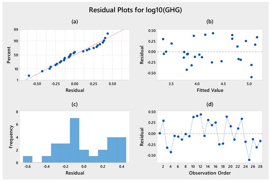 Statistical analysis results for GHG and energy consumption in Canadian HEIs: (a) normal residual probability plot, (b) residual versus fitted value, (c) histogram, and (d) residual versus observation order.