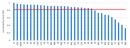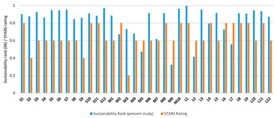 A comparison between the STARS ranking and the ranks established in the present study for all sizes of HEIs are presented in Figure 9. The figure shows that of the 10 worst-performing HEIs in Figure 6, the sustainability ranks of four HEIs (M3, M4, M7, and L4) were approximately equal or higher than the STARS ratings. These HEIs need to: (i) implement the SD declarations by embedding sustainability in the fabric of the organizational structure and by planning and setting realistic goals and (ii) use renewable fuel sources. The sustainability ranks presented in Figure 9 were calculated based on comparative assessment. Hence, a higher SR does not ensure that there is no need for further improvement. To attain long-term sustainability, HEIs should adopt a continuous performance improvement approach.