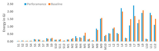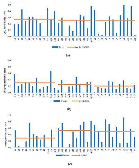 The data for the 34 HEIs primarily obtained from the STARS database shown in Figure 8a–c presents the aggregated sustainability scores for WEC flows. The values were normalized by dividing the score of each institution in the WEC category by the total grade. Figure 8a illustrates that, regardless of size, the performance of all HEIs was similar in terms of GHG emissions while some of the large-sized HEIs clearly underperformed, i.e., L2, L3, L7, and L12. In the case of energy consumption, small-sized HEIs outperformed large- and medium-sized HEIs as shown in Figure 8b. Figure 8c shows that the water-consumption performance of medium- and large-sized HEIs was similar.