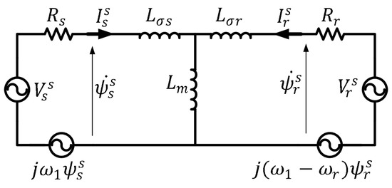 Figure 1 shows the DFIG circuit in synchronous frame [7], where denotes for synchronous speed, stands for rotor speed, and superscript s expresses the synchronous frame. and are rotor and stator resistances, respectively. is mutual inductance and and express the rotor and stator leakage inductances, respectively. Eventually, and denote for rotor and stator flux, respectively. Rotor and stator flux in synchronous frame is illustrated in Figure 2, where and are stationary and rotor frames, respectively. and stand for stator flux and rotor angles, respectively.