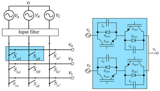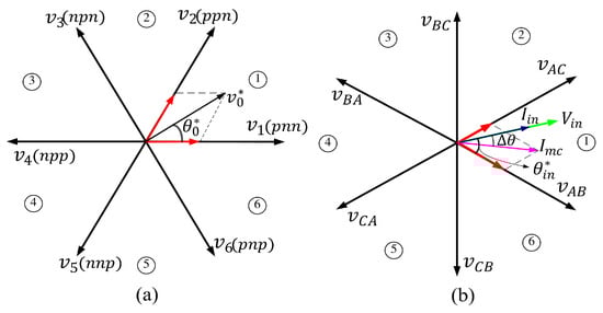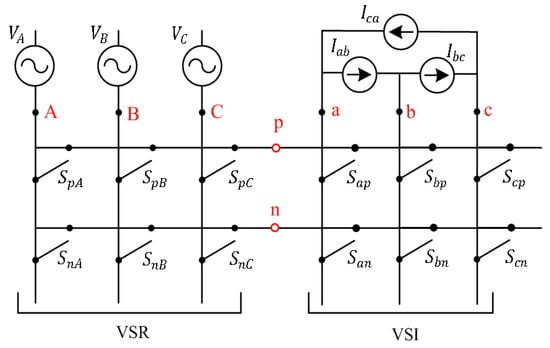 In ISVM technique, the matrix converter is split into an artificial voltage source rectifier (VSR) and a fictitious voltage source inverter (VSI), as reported in Figure 6. The phase angle of input current is controlled using VSR, while and are modulated by means of VSI.