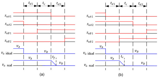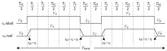Considering Figure 8, the output phase voltage for phase a () for both ideal and real IGBT is expressed as (20) and (21). As can be concluded, a voltage error exists among real and ideal cases which is obtained as (22), where and v are reference and actual voltages, respectively.