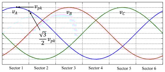 If the above discussion is extended to all input and output voltage sectors, a general equation for edge uncertainty voltage error is obtained as (23), where i and j stand for output and input phases. It is concluded from this equation that edge uncertainty voltage error is dependent to the amplitude of input phase voltage and sign of output phase current, and also inversely is proportional to PWM switching time interval. The nonlinear voltage errors for all input sectors are tabulated in Table 1. In addition, the input phase voltages and their corresponding input sectors are illustrated in Figure 9.