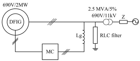 In this section, in order to demonstrate the effectiveness of the control technique proposed in Section 3, various simulations are performed and the results are presented and analyzed. The schematic diagram of the system under test is shown in Figure 10, where RLC filter is considered to absorb the switching harmonics produced by the modulation of the matrix converter. The power of the double-fed induction generator under study is 2 MW whose specifications are tabulated in Table 2. In addition, the switching frequency and sampling frequency has been set at 5 [kHz].