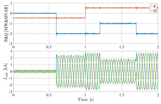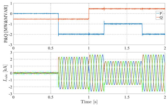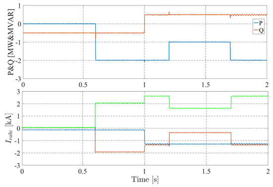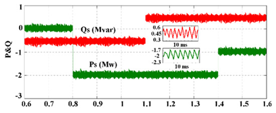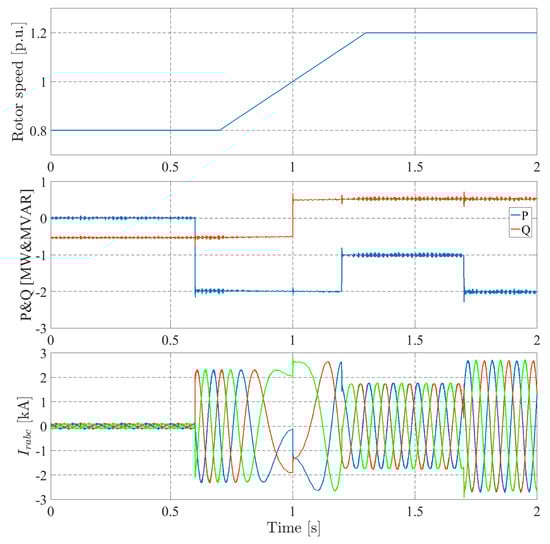 Figure 11 reports the simulation results at synchronous speed, where the speed of the rotor is fixed at 1 p.u. As seen, the reactive power set point was at −0.5 [MVAR], while it goes to 0.5 [MVAR] at [s]. On the other hand, the active power reference has a step change from zero to −2 [MW] at [s] and goes to −1 [MW] at [s], and again goes back to −2 [MW] at [s]. It is noted that negative sign “−” implies on active power generation and reactive power absorption by DFIG. As seen from this figure, both powers follow their set points precisely. Furthermore, rotor current is shown in this figure. It is evident from the rotor current waveform that it is dc, because of setting rotor speed at synchronous speed.