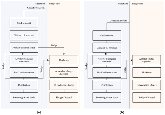 Before discharging into a receiving body, the wastewater shall be subjected to mechanical, biological and chemical treatment. Conventional activated sludge wastewater plants are classified as made according to using a “classic process diagram” (Figure 1a) or a “simplified process diagram” (Figure 1b).