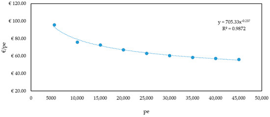 As far as the civil works are concerned, we calculated the quantity of such works to be carried out and their costs per each type of wastewater plant (we proceeded by designing nine of them ranging from 5000 pe to 45,000 pe). It appeared that the greatest benefit is obtained when increasing the size of a plant from 5000 pe to 10,000 pe (the decrease is almost 20.00 €/pe), while from 10,000 pe to 20,000 pe the economic benefit observed is smaller and from 20,000 pe to 45,000 pe is very little.