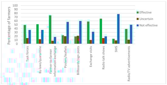 There were mixed perceptions on the effectiveness of the different sources of information on BXW control (Figure 2). Farmer-to-farmer information exchange, radio talk shows, and exchange visits were perceived to be more effective, whereas short message service (SMS), posters/leaflets, and billboards/posts were perceived as less effective. These results are in line with the earlier study by Tunio et al. [43], which also reported that farmer-to-farmer exchange and radio are the most effective information sources regarding diffusion of recommended technologies among rice growing farmers in Pakistan.