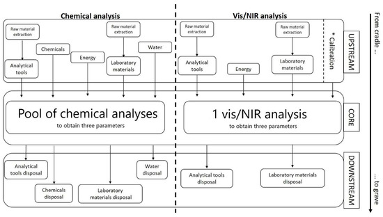A “cradle to grave” approach was chosen. Figure 2 shows the reference flow of the two analysis methods. The “cradle to grave” approach allowed us to consider different factors from the extraction of the raw materials, the construction of the tools, the production of laboratory materials, the chemicals, and the calibration for the vis/NIR analyses (up-stream). It included the core of the study, defined as the pool of three chemical analyses for the chemical approach and one optical analysis used to evaluate three chemical parameters for the optical approach. Moreover, in the downstream, this approach considered the disposal of every single component entered in the system with different waste management scenarios.