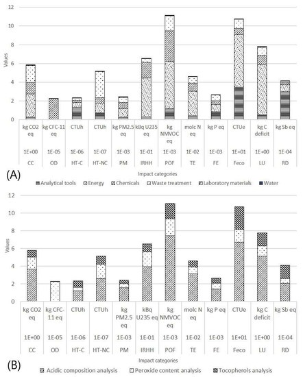 Analogous considerations could be reached focusing the grouping on the type of analysis as factors. Figure 3b reports the subdivision of the environmental impacts in term of analysis type. The hotspots, in this case, depended on the considered impact category. The analysis showing the higher responsibility was the “acidic composition analysis”, considering the impact categories overall. Its high level of incidence in all the impact categories depended mainly on the energy-consuming nature of this analysis. The “peroxide content analysis” showed a high amount in the impact category OD due to the quantity and type of chemicals used. Despite this, this analysis was overall considered to be environmentally safer in comparison with the other two. The “tocopherols analysis” showed a balanced distribution of the percentage of responsibility in all the impact categories. The main contribution to its impact assessment derived from the analytical tools (e.g., HPLC), both in term of construction and in terms of energy demand necessary to perform the analysis.