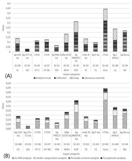 The aim of the work is to calculate the environmental impact of the crucial analyses for the control of the qualitative parameters of olive oil. Chemical analyses were analysed and vis/NIR spectroscopy was considered as an alternative methodology to replace chemical analyses in the oil sector [34,35]. Finally, a comparison was performed between the environmental impact of the chemical analyses and the vis/NIR spectroscopy analysis.