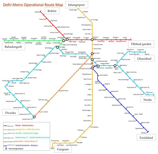 New Delhi has been served by its rapid transit system, the DMR, since 2002; it was built in phases. Currently, its network is 317 km long, with 231 stations. The DMR connects New Delhi to the cities of Bahadurgarh, Faridabad, Ghaziabad, Gurgaon and Noida in the National Capital Region (NCR). It is operated and managed by the DMRC. Figure 1 shows the Delhi Metro route network (Phase I and II) existing at the time of our studied data.