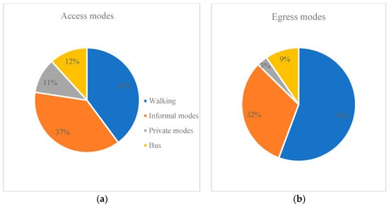Comparing access and egress, access distance is slightly longer than egress in the case of walking and informal, while shorter in the case of bus.
