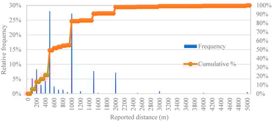 Figure 3 shows the relative frequency distribution and cumulative distribution of access distances by walking. It can be seen that these distances have been heaped at particular points, multiples of 100, 500 and 1000 m. This confirms that the reported distance contains rounding effects. In addition, more observations are reported for shorter (less than 1000 m) versus longer distances. The observations become coarser and clustered around multiples of 500 or 1000 m for longer distances. This implies that the respondents rounded most distances, and the coarseness level of the reported distance increases with the traveling distance. Figure 3 also demonstrates big jumps at multiples of 500 and 1000 m.