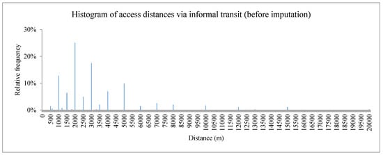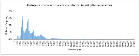 Repeating this procedure m times gives m imputed data points that properly reflect the uncertainty of imputation. In this study, we repeated the procedure 1000 times to approximate the true values of distance for each mode. For example, Figure 4 and Figure 5 display the original and imputed data of the informal mode, respectively. Before imputation, all reported distance data were concentrated at multiples of 100, 500, 1000 and 5000 m.