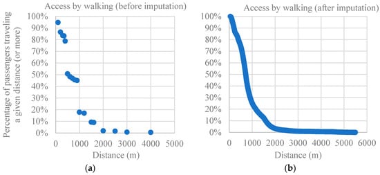 (a) Distribution of distances for access by walking before imputation; (b) distribution of distances for access by walking after imputation.