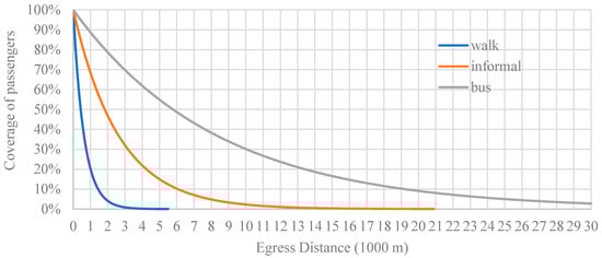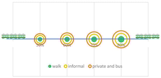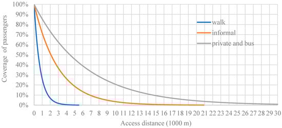 The 85th percentile value has been calculated to define catchment areas around transit stations for walking and cycling [,,]. Therefore, we consider the 70th–90th coverage percentile for each mode in order to evaluate the appropriate influence areas. As shown in Table 6, the 85th percentile distances for access are 1400 m for walking, 5600 m for informal transit, 11,900 m for private transport and buses, estimated from the decay functions with imputed data. Informal transit has a shorter distance than private transport and buses, since some informal modes (such as cycle rickshaws) cannot cover distances as long as motorized modes.