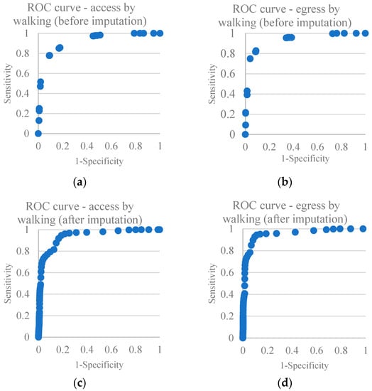(a) Receiver operating characteristic (ROC) curve for access by walking before imputation; (b) ROC curve for egress by walking before imputation; (c) ROC curve for access by walking after imputation; (d) ROC curve for egress by walking after imputation.