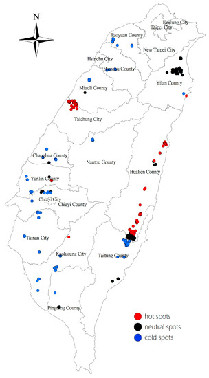 The blue points denote cold spots where organic farmland and its surroundings are positively spatially correlated with certified areas of lower value. The black points are neutral spots classified as spatial outliers whose certified areas report no statistical significance. The results for LISA show that a majority of the hot spots are distributed in the eastern region and a portion of the western region in Taiwan, namely the counties of Hualien, Taichung, and Miaoli. In addition, the neutral spots are largely located in Yilan and the junction between Hualien and Taitung. Clusters of cold spots are mainly diffused along the western region, particularly in its central and southern counties, where there are principal agricultural production areas for rice that employ conventional agriculture methods. In such areas where organic agriculture already has a foothold, we believe a policy aimed at promoting organic agriculture will be more effective.